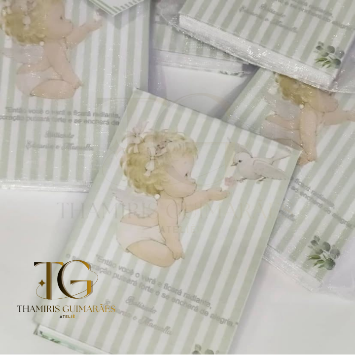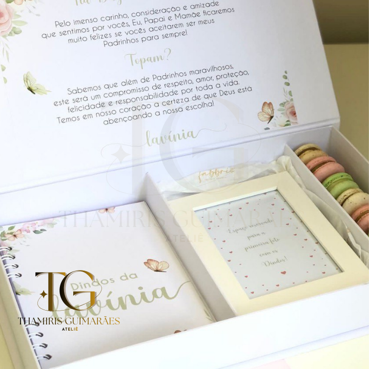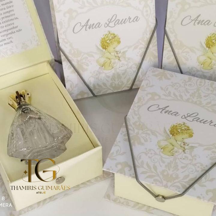 Caixa 16x11x5 com berço de encaixe vidro nossa senhora, personalização impressa vinil fosco. Fechamento com elástico.