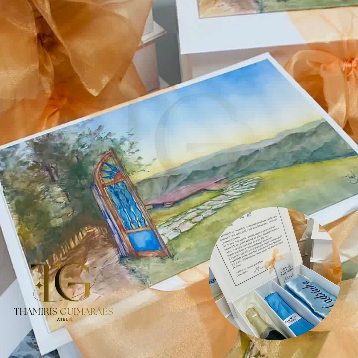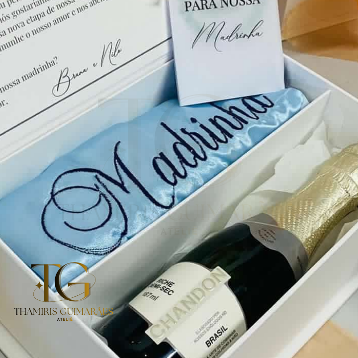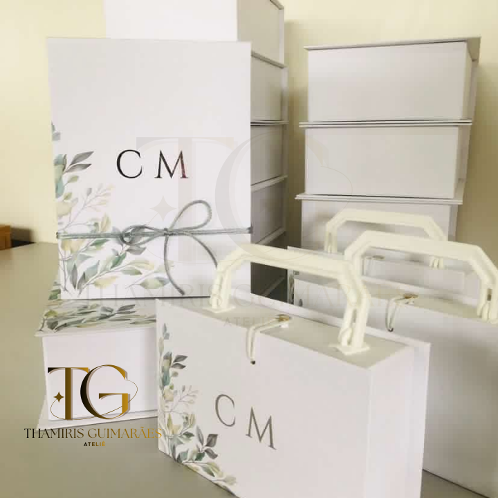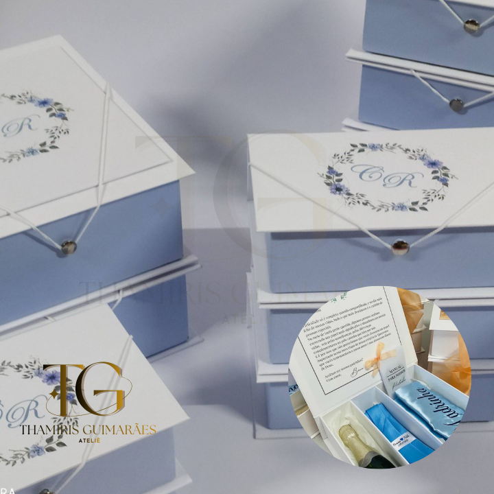 Caixa padrinhos 22x15x7 e maletas pajens e daminhas 20x15x5 Personalização com impressão e Hot Stamp Cor: Alaska
