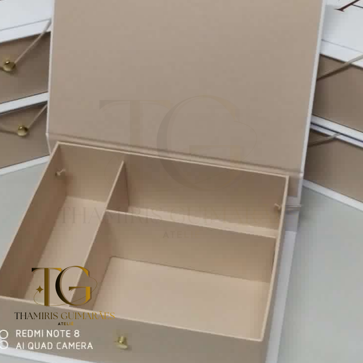 Caixa 25x25x8 com divisória e fechamento em elástico Personalização em Hot Stamp Cor: Alaska e Nude