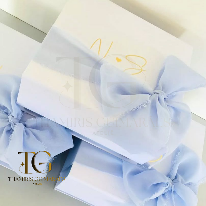 Caixa 20x20x10 fechamento em imã e laço em tecido Personalização com Hot Stamp Cor : Alaska
